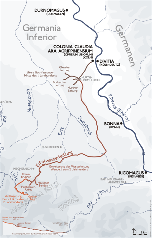 Die Römer haben bereits vor über 2000 Jahren Wasserleitungen über viele Kilometer gelegt, um größere Städte wie z.B. Colonia Claudia Ara Agrippinensium (heute: Köln) ausreichend mit Wasser zu versorgen. Hier eine Karte mit dem Verlauf der Eifelwasserleitung, die als längste römische Wasserleitung nördlich der Alpen gilt.