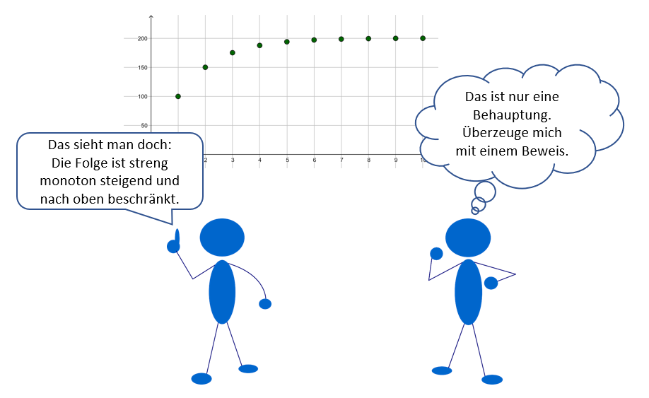 Einstieg - Überzeugungsarbeit Behauptungen nachweisen Wenn man jemanden von etwas überzeugen will, dann muss man oft überzeugende Argumente liefern. Zielsetzung Unser Ziel ist es hier, Eigenschaften von Folgen präzise nachzuweisen. ←Zurück Weiter→ q Startseite 2. Folgen + 1. Das Folgenkonzept + 1. Erkundung - Begrüßungen Einstieg - Das Begrüßungsproblem Erarbeitung - Lösung des Problems Vertiefung - Lösung mit einer Zahlenfolge + 2. Erkundung - Türme von Hanoi Einstieg - Ein Umschichtproblem Erarbeitung - Umschichtverfahren Erarbeitung - Anzahl der Züge Vertiefung - Berechnungsformeln Exkurs - Lösungsverfahren + 3. Strukturierung - Der Folgenbegriff Einstieg - Zielsetzung Erarbeitung - Folge als Funktion Vertiefung - rekursive Folgendarstellung Exkurs - Folgenberechnung mit einer Tabellenkalkulation + 4. Übungen - Folgenkonzept + 1. Knobelprobleme + 2. Wachstums- und Zerfallsprozesse + 3. Heron-Verfahren + 4. Fibonacci-Folge + 5. Forschungsprojekt - Collatz-Folgen Das Collatz-Problem Auf dem Weg zu einer Vermutung Die Collatz-Vermutung Änderungen des Bildungsgesetzes + 6. Überprüfung - Folgenkonzept + 7. Zusammenfassung - Folgenkonzept - 2. Eigenschaften von Folgen + 1. Erkundung - Trainingspläne + 2. Strukturierung - Begriffsdefinitionen Einstieg - Kommunikationsprobleme Vorbereitung - Vergleichsoperatoren Erarbeitung - Monotonie bei Folgen Erarbeitung - Beschränktheit bei Folgen Überprüfung - Anwendung der Begriffe Vertiefung - Begriffsbildung - 3. Strukturierung - Nachweis von Eigenschaften Einstieg - Überzeugungsarbeit Erarbeitung - Begründung von Eigenschaften Vertiefung - Begründungen und Beweise + 4. Übungen - Monotonie und Beschränktheit + 5. Überprüfung - Monotonie und Beschränktheit + 6. Zusammenfassung - Monotonie bei Folgen + 7. Zusammenfassung - Beschränktheit bei Folgen