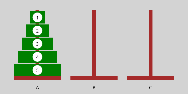 Die Zahlenfolge $1; 3; 7; 15; 31, ...$ beschreibt die Anzahl der Bewegungen bei einem Ausgangsstapel mit $1; 2; 3; 4; 5; ...$ Scheiben.