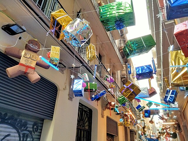 In Barcelona findet jedes Jahr im August das Gràcia-Festival statt. Bei diesem Fest konkurrieren die Straßen des Viertels Gràcia, wer die am schönsten dekorierten Straße hat. Das Foto zeigt die Dekoration einer Straße aus dem Jahr 2022.
