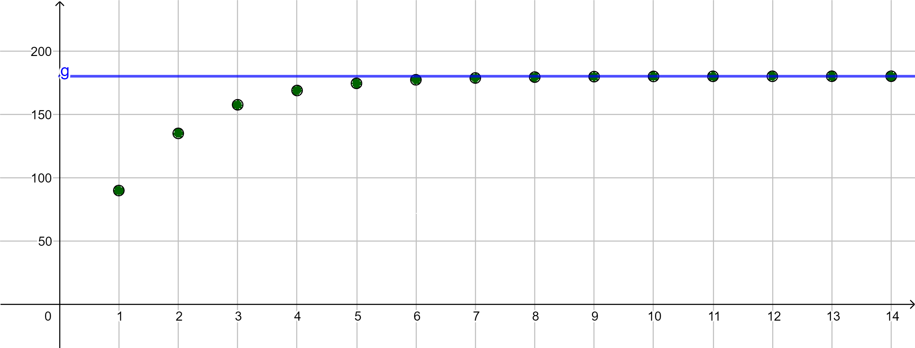 Die Folgenglieder stabilisieren sich mit wachsender Platznummer bei einem Grenzwert $g = 180$.