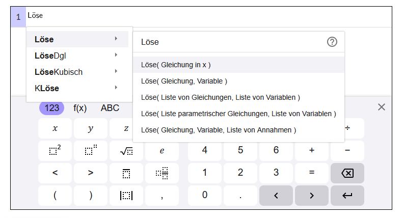 Gib in der ersten Eingabezeile den Befehl $\text{Löse}$ ein. Es öffnet sich ein Fenster mit den verschiedenen Verwendungsmöglichkeiten dieses Befehls.