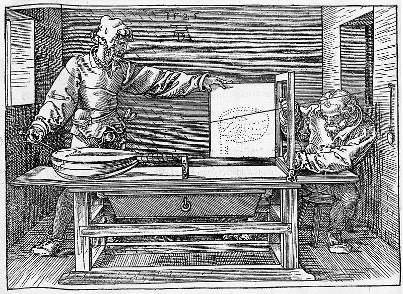 - [1]: Underweysung der Messung, mit dem Zirckel und Richtscheyt, in Linien, Ebenen unnd gantzen corporen - Urheber: Albrecht Dürer - Lizenz: Gemeinfrei