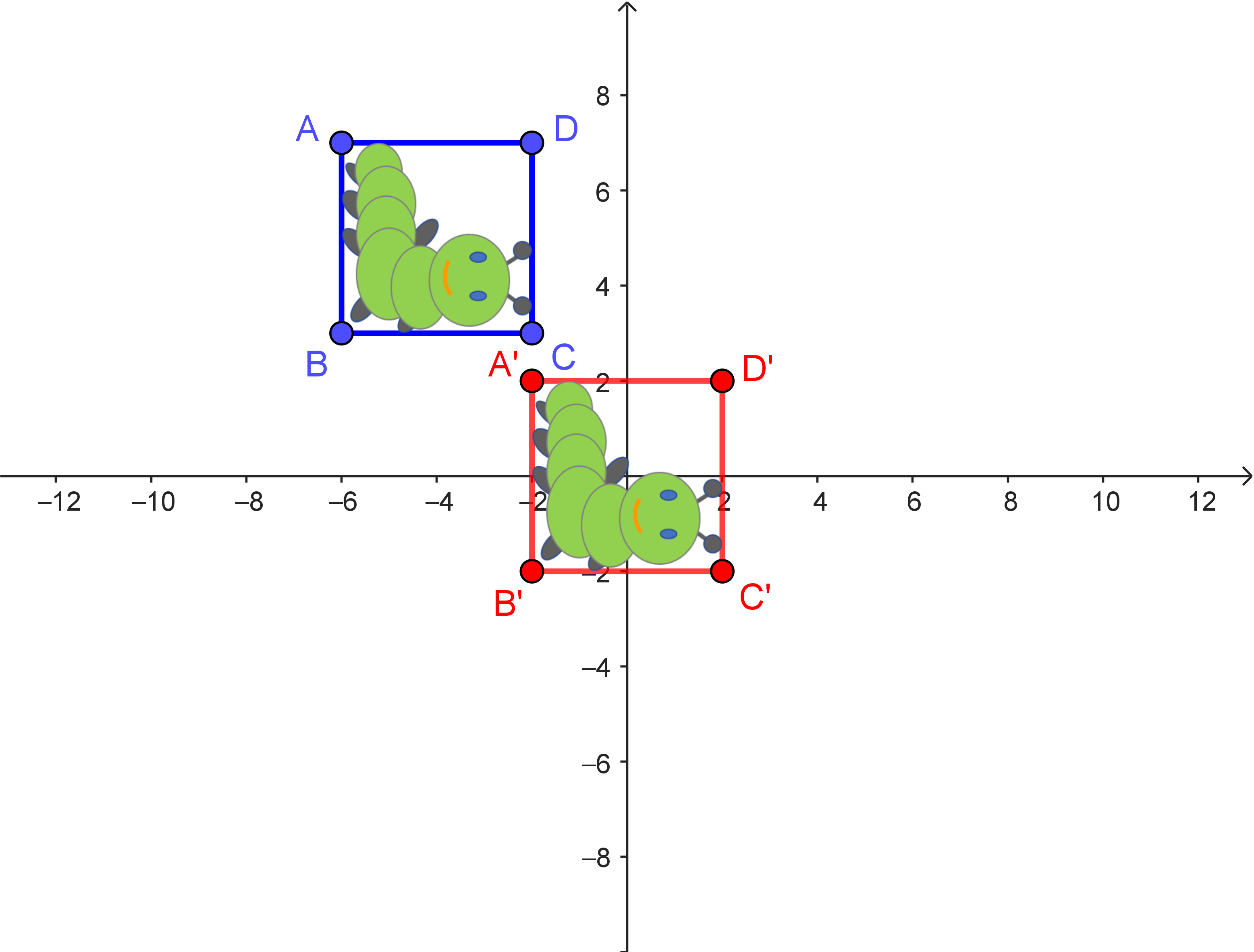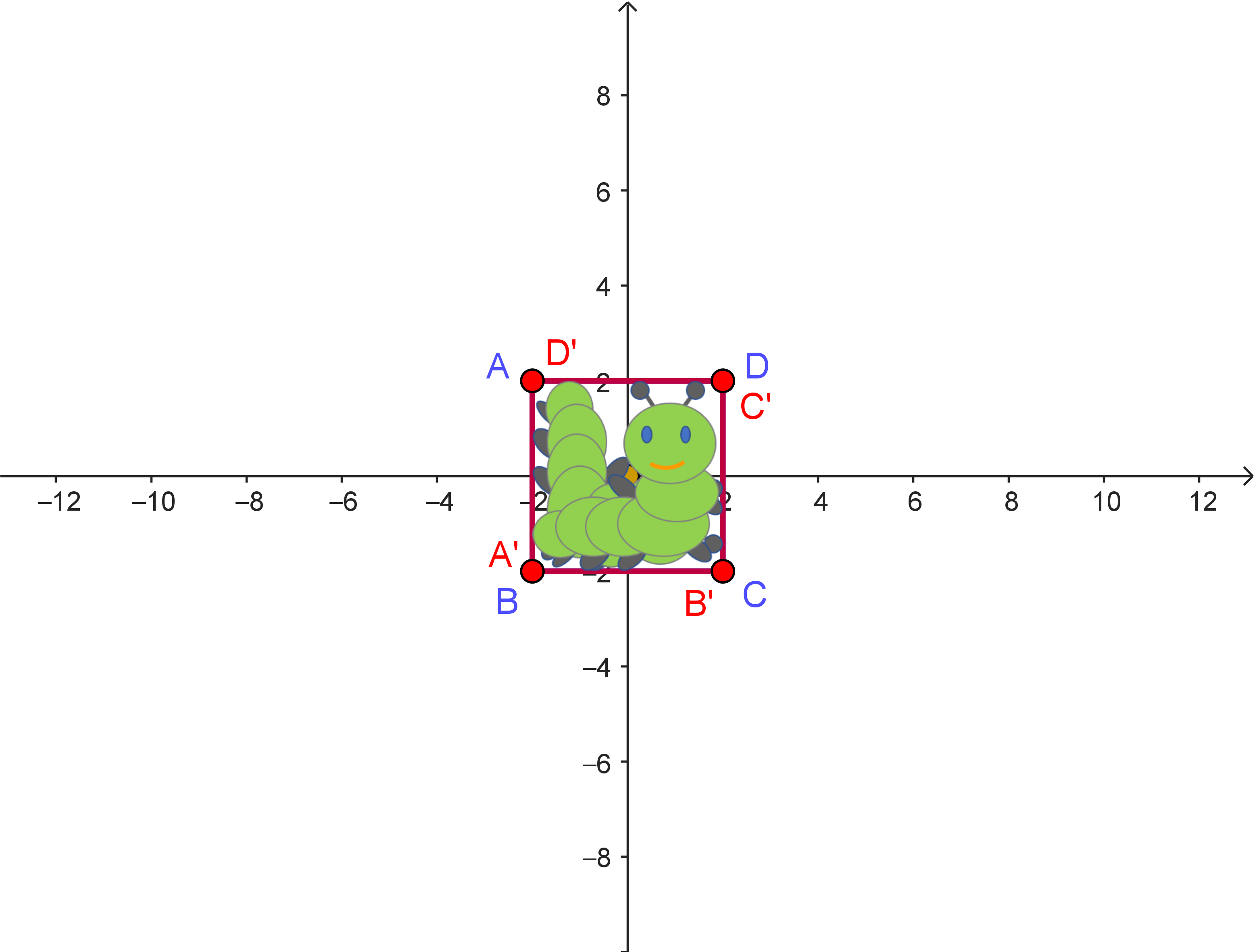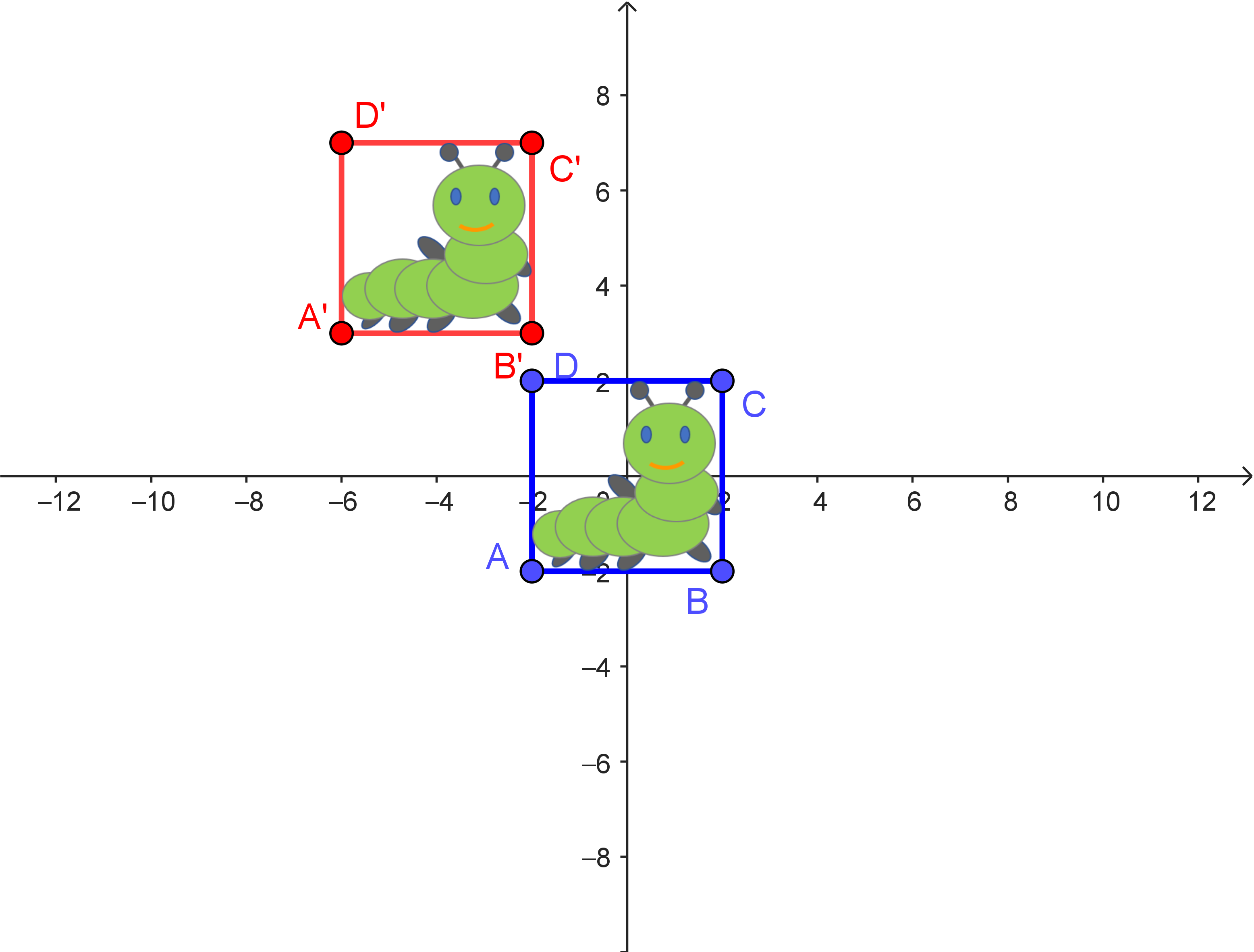 | $\begin{array}{c} \begin{pmatrix} -6 \\ 7 \end{pmatrix} \\ \downarrow \\ \begin{pmatrix} -6 \\ 7 \end{pmatrix} + \begin{pmatrix} 4 \\ -5 \end{pmatrix} = \dots \\ \downarrow \\ \begin{pmatrix} 0 & -1 \\ 1 & 0 \end{pmatrix} \cdot \left[ \begin{pmatrix} -6 \\ 7 \end{pmatrix} + \begin{pmatrix} 4 \\ -5 \end{pmatrix} \right] = \dots \\ \downarrow \\ \begin{pmatrix} 0 & -1 \\ 1 & 0 \end{pmatrix} \cdot \left[ \begin{pmatrix} -6 \\ 7 \end{pmatrix} + \begin{pmatrix} 4 \\ -5 \end{pmatrix} \right] + \begin{pmatrix} -4 \\ 5 \end{pmatrix} = \dots \end{array}$ | $\begin{array}{c} \begin{pmatrix} x_1 \\ x_2 \end{pmatrix} \\ \downarrow \\ \begin{pmatrix} x_1 \\ x_2 \end{pmatrix} + \begin{pmatrix} 4 \\ -5 \end{pmatrix} \\ \downarrow \\ \dots \\ \downarrow \\ \dots \end{array}$ |