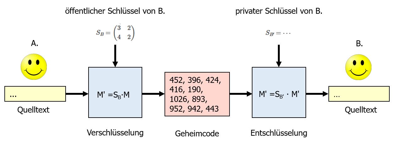B. erzeugt auch ein Schlüsselpaar bestehend aus dem öffentlichen Schlüssel $B = \begin{pmatrix} 3 & 2 \\ 4 & 2 \\ \end{pmatrix}$ und dem hierzu passenden privaten Gegenschlüssel $B'$ (den B. ebenso nicht verrät).