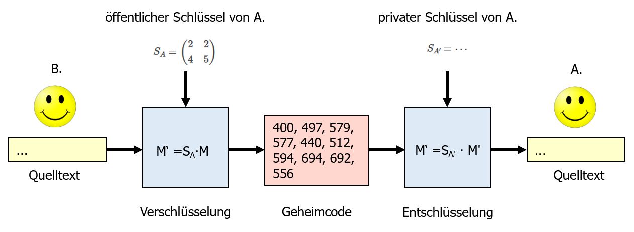 Solche asymmetrischen Verschlüsselungssysteme werden heutzutage u.a. im Internet für eine sichere Kommunikation benutzt. Wir spielen den Nachrichtenaustausch mit einem solchen Verschlüsselungssystem hier in vereinfachter Form mit dem Matrixmultiplikationsverfahren durch.