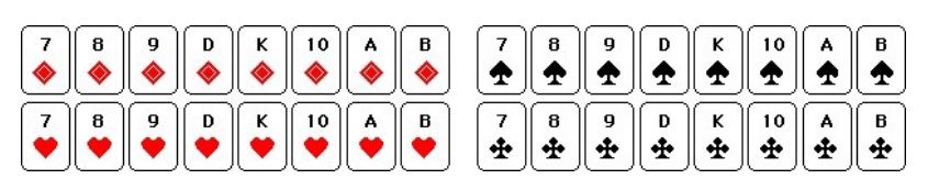 Die Abbildung zeigt ein vollständiges Skatblatt mit den Farben Karo ♦, Herz ♥, Pik ♠ und Kreuz ♣.